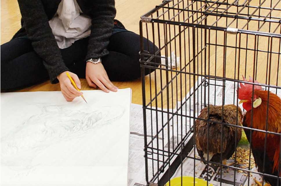 1・2年次の基礎課程では日本画の絵画、素材、用具の基礎知識を学び、デッサン、模写などの課題を通して、表現、創造を自由に駆使するための基礎技法を習得します。また、伝統の技法を現代の新たな技法へと展開する表現力も鍛えます。3・4年次の専門課程では、主体的にテーマを選び、教員との徹底的な対話の中から独自の表現方法を探求し、創造力を高めます。