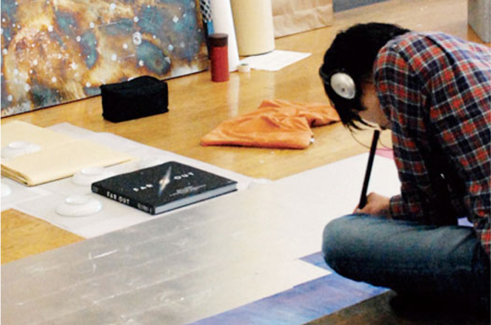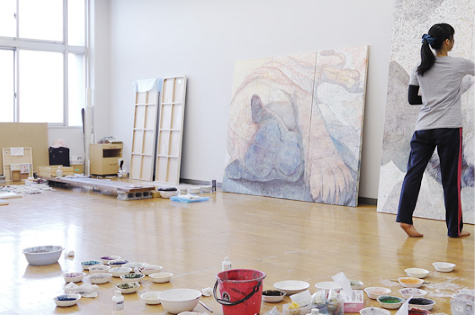 自由な創造性を発揮し、日本美術の可能性を拡げ続けている日本画専攻。「日本画」が世界的な注目を集める近年は留学生も多く、グローバルな環境で学んでいます。筆作りや絵具作り、表具実習や絹本実習といった伝統技法はもちろん、油画専攻や版画専攻と合同で行う技法講座ではテンペラ、銅版画、映像、パフォーマンスなど幅広いカリキュラムを用意。伝統を踏まえつつ多様な表現に触れることで育まれる自由な気風が、日本美術に大胆な創造性をもたらす作家はもちろん、出版、ゲーム、アニメーションなど多彩なクリエイターを育んでいます。