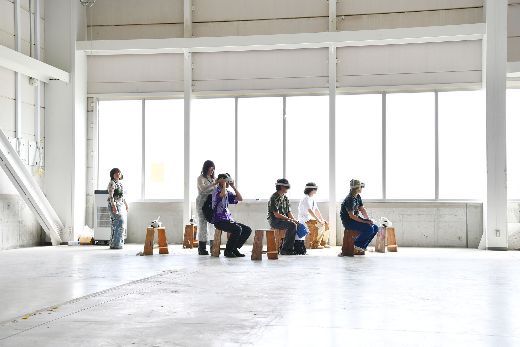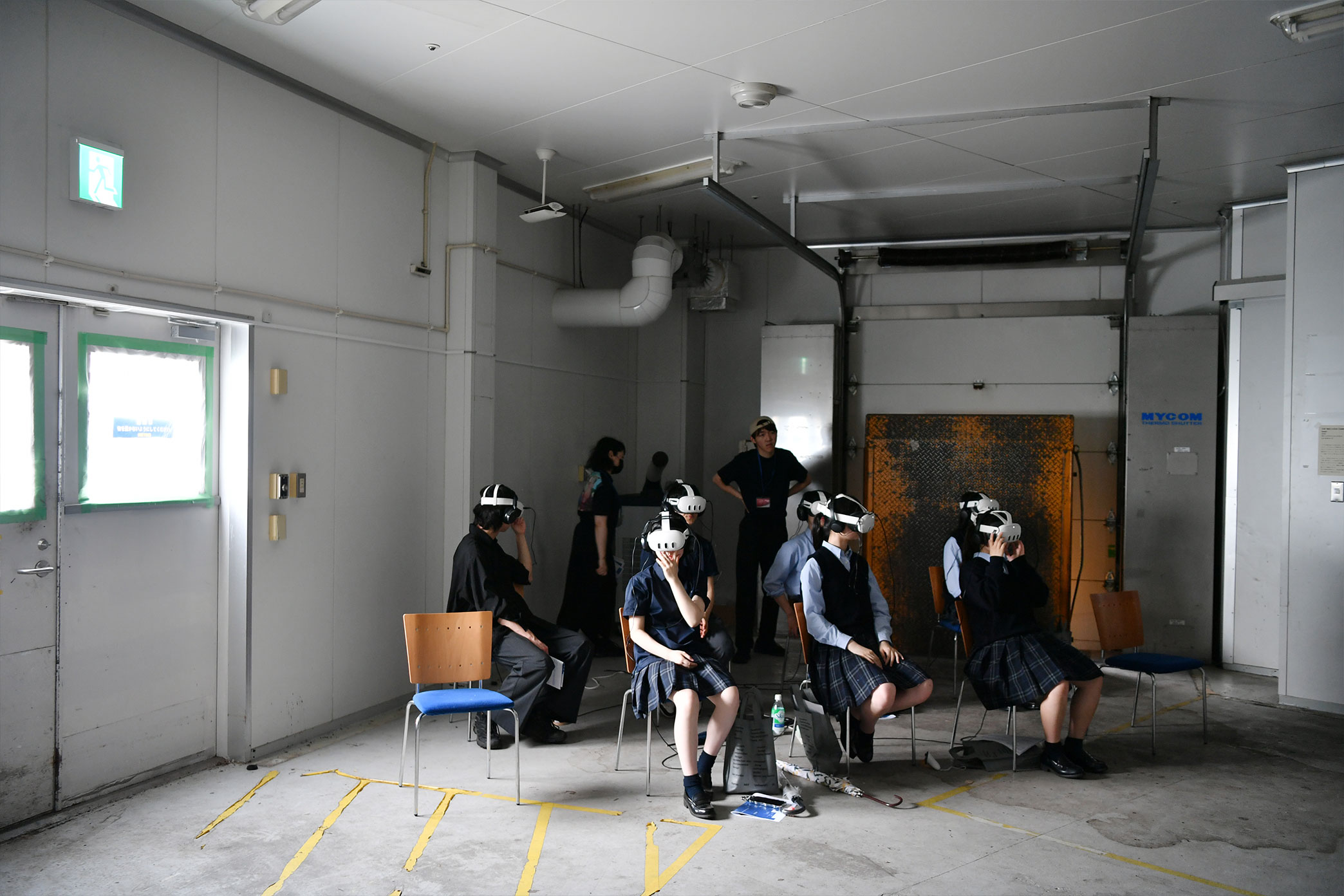 BLUE CUBE(仮称)の広大な施設内でさまざまなプログラム/展示が行われていますが、軸となっているのは3つのVR体験スペースです。メインといえる会場の中心には、イベントタイトルを冠した「A:思えばそれはBの話でもあったし Cさえも含まれていたの」VRスペースが、来場者を出迎えます。雨宮庸介准教授のMETROと多摩美についての個人多的な記憶や入手経路にまつわることが織り込まれたVR作品をまず体験します。VRを体験したあとには、VR映像と会場の境のあいまいさを実感し、「今ここにいること」をより強く感じさせられることになります。