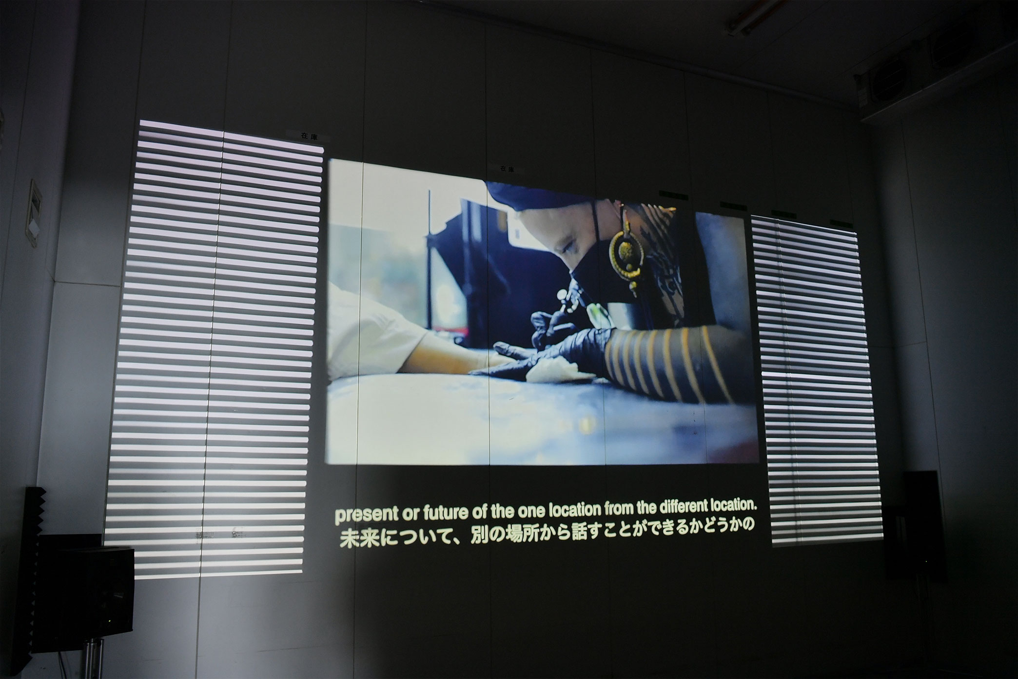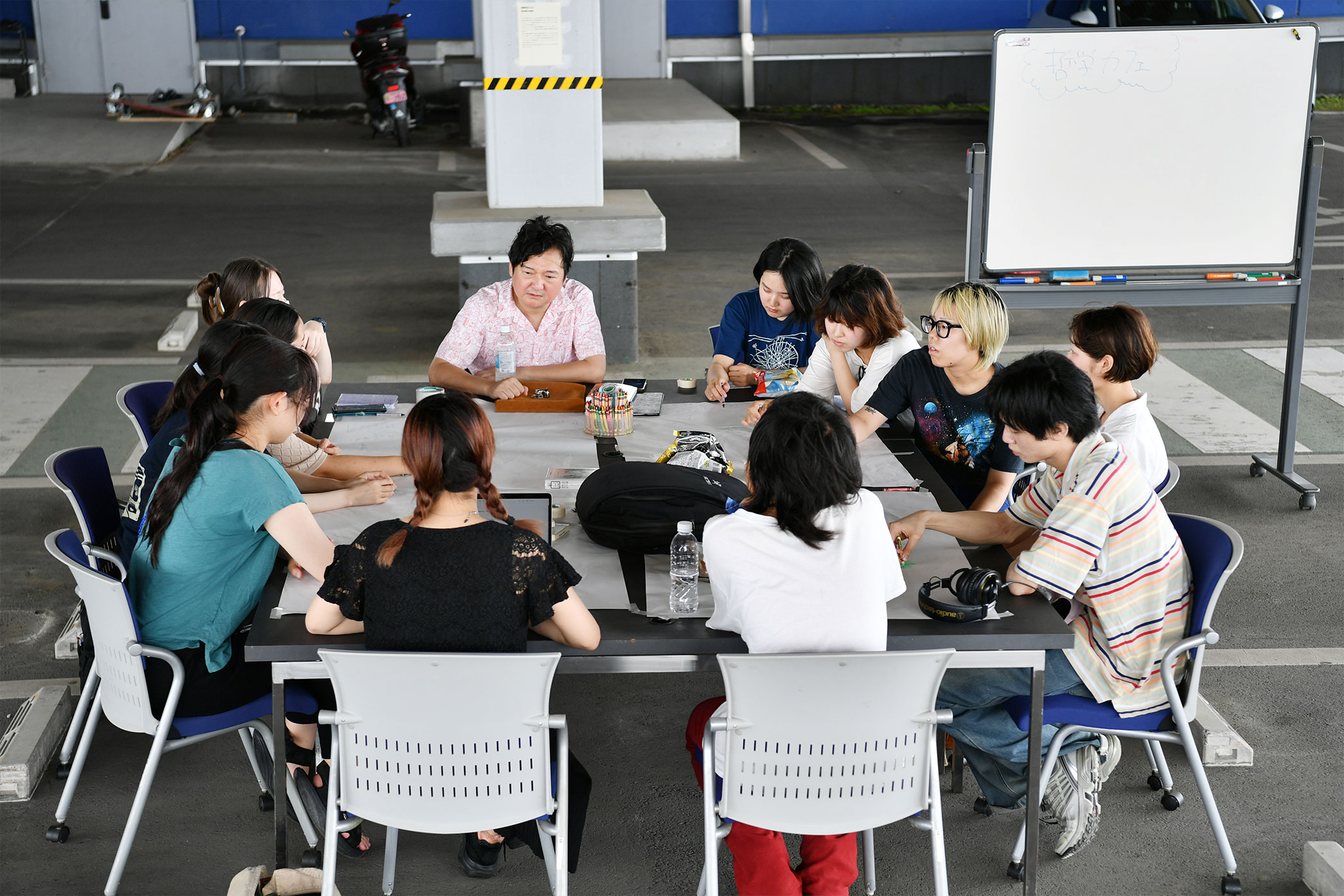 《清水将吾+参加者》 「たまび哲学カフェ」は『左右を哲学する』の著者でもある清水将吾が主催する第3・5週目水曜日の14:00〜16:00にかけて行われるイベントで、普段は大学内のリベラルアーツセンター1階学生ラウンジにて開催される。 今回のイベントでは、出品作品の鑑賞からスタートし、椅子とテーブルとホワイトボードを用意した屋上の屋根付き駐車場で哲学対話を行う。 清水は通常の講義でも芸術と哲学の並走をテーマにすることがある。今回のイベントの中で開催される哲学カフェは、まさにVRやパフォーマンスといった作品との並走状態に置かれることになるが、哲学カフェ自体もまた、レクチャーパフォーマンスとして他の作品と並走している。 美術と哲学が本当に並走し始めるとき、そこではどんな化学反応が起こるのだろう。