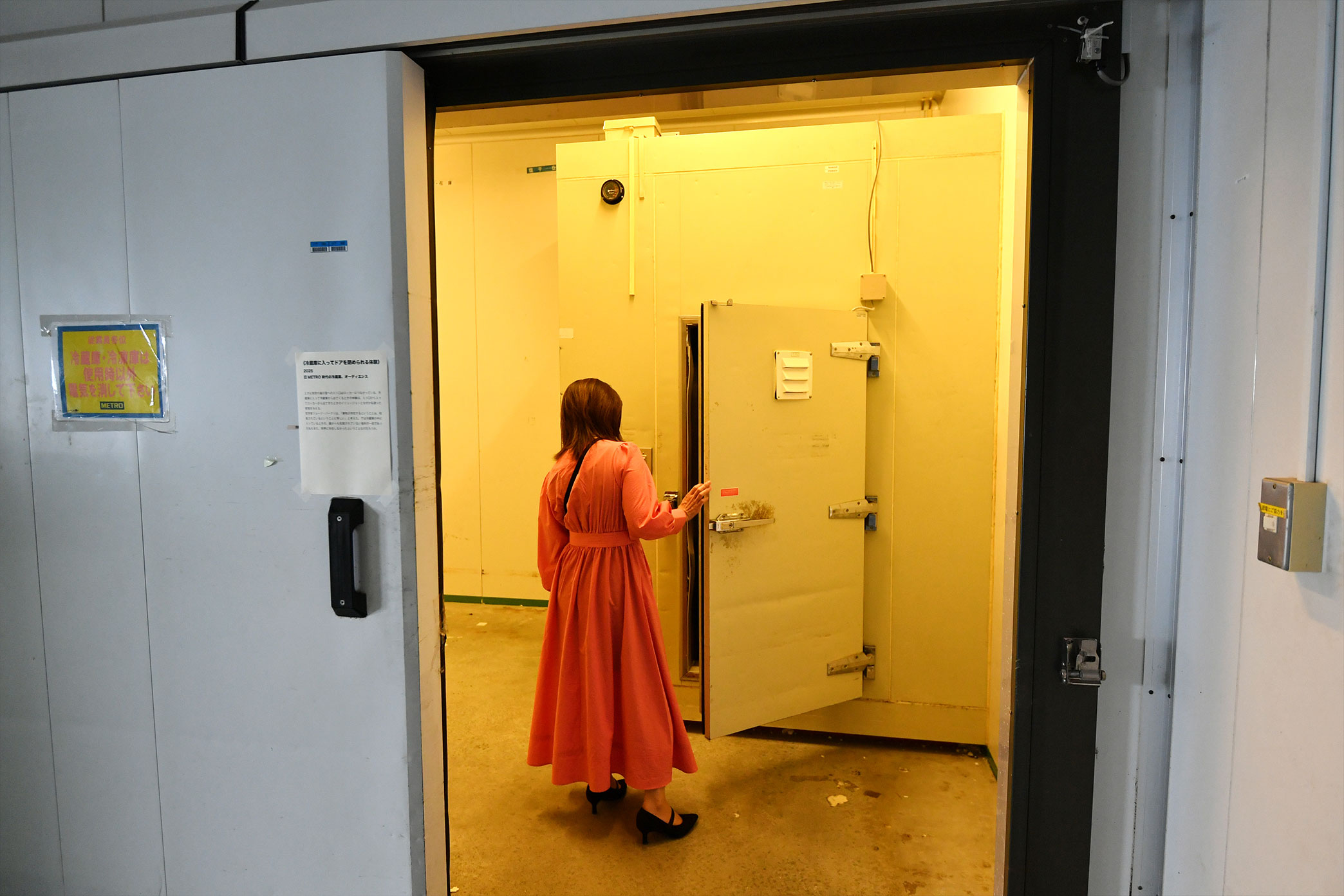 《雨宮庸介2025 VRヘッドマウントディスプレイ 2分30秒 ループ》 ドアの本質を描いた作品である『モンスターズインク』や、『ドラえもん』に登場する「どこでもドア」は、共にここではないどこかといまここを繋ぐ。ならば擬似的なドアとして、VRヘッドマウントディスプレイ(HMD)について考えることもできるのではないか。 しかし、雨宮はVRHMDを「どこかではないここに丁寧に連れ戻し、この世界そのものについて肯定を試みる」ためのデバイスへと裏返す。今は使われていないバックヤードは、複数の小部屋ごとに温度管理された冷蔵庫であった。 VRの冷蔵庫が開閉され、食品用の搬入口が開く。外からは鳥のこえが運び込まれる。