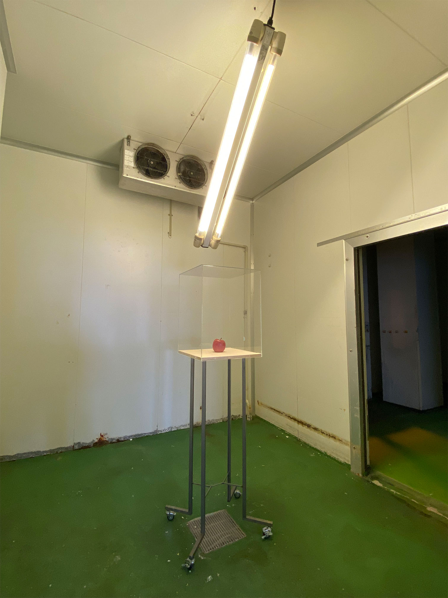 《雨宮庸介2007(2019に加筆) FRPに油彩 林檎実物大》 雨宮が活動の初期(1999年)から継続的につくりつづけているシリーズ。溶けた形状のものがひろく知られている。現在では「林檎の木材」を素材にしているが、この作品を含む初期のものはFRPを使用している。 大型食品卸売店としてのストラクチャーを活かす新美術館の構想も、本来展示されることのない「まだ溶けてない」林檎も、一般的に見せないはずのものを露わにしてそのままにする。 雨宮は初期から一貫してVとRをテーマとしてきたが、ここでは「一般に見せないはず」のヴァーチャルなものを、リアルな場へと「露わにしてそのままにする」という反転した現実の溶かし方が見られる。