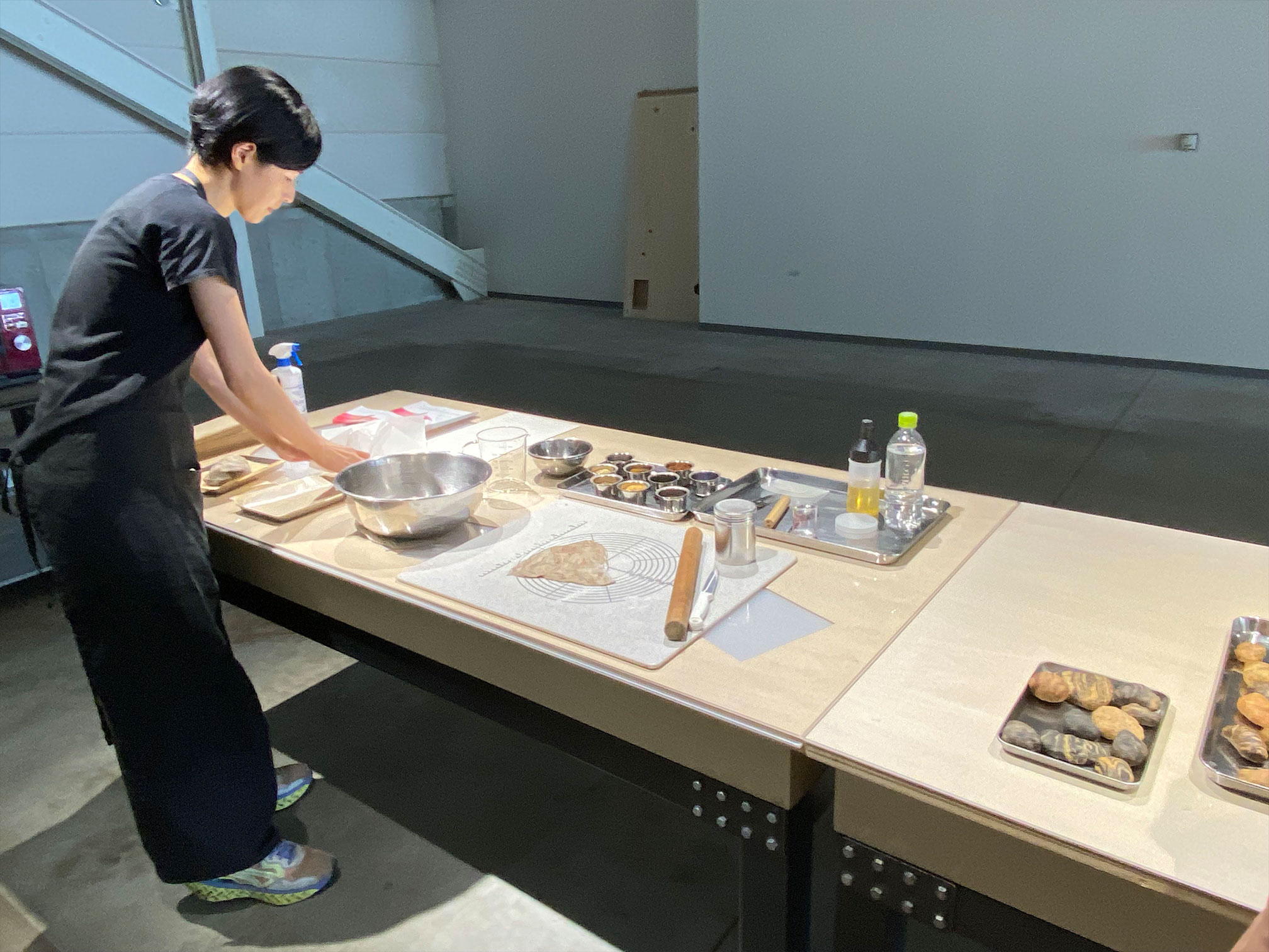 「山フーズのケータリング」では、これはBLUE CUBE(仮称)という場所が持つ空気感や今回のイベントにインスパイアされ、「食べられる石が飛行する(かもしれない)」仮説を検証するケータリングを出品。