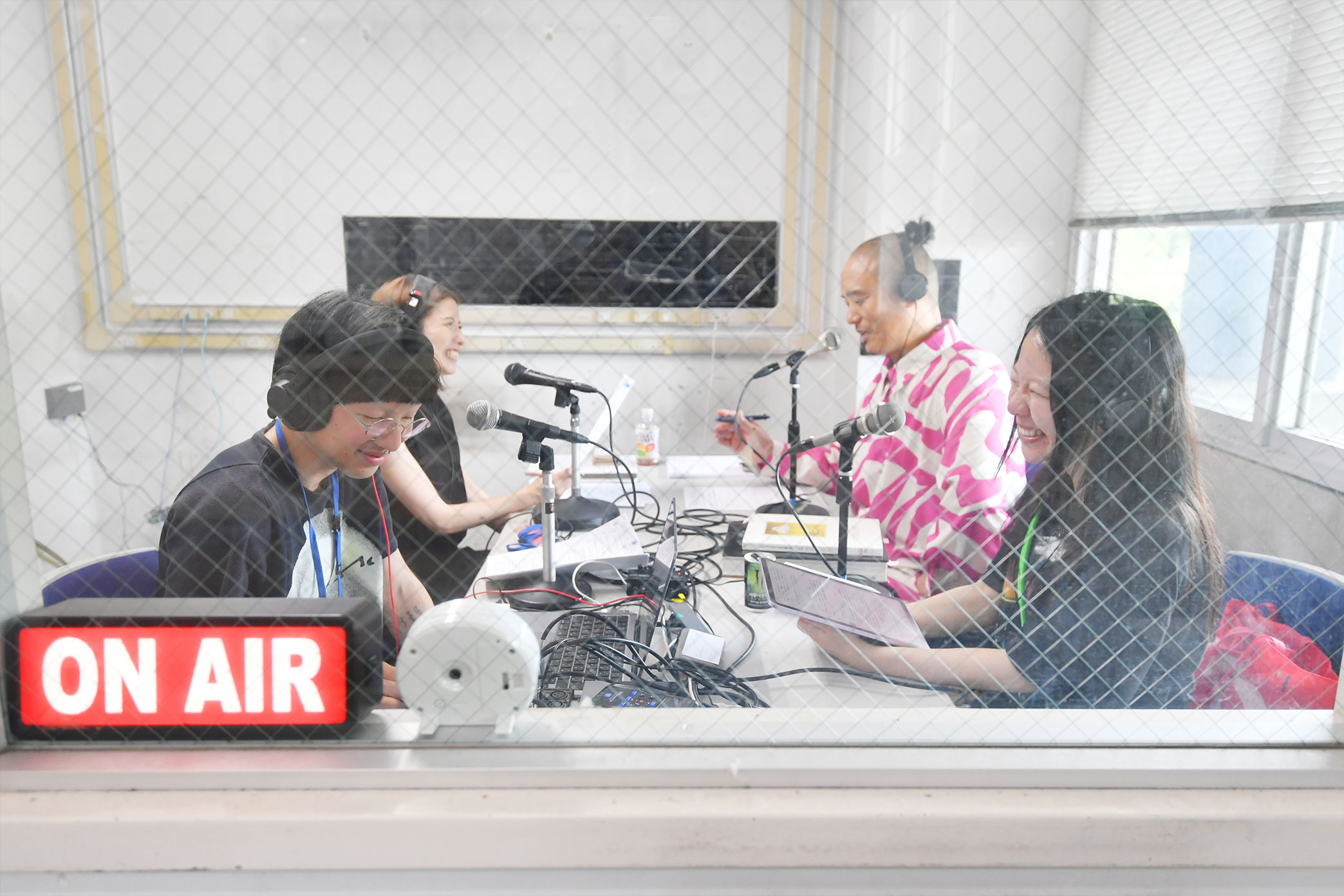 《ラジオ公開生収録2025》 美術大学内にすでにあるクリエイティヴなコンテンツを、効率的に顕在化させるツールの実験としてのラジオ。それは、研究と教育の機関である大学内の展覧会を構成する要素として最適なのではないか?この仮説を検証するために、1時間半に一度の間隔で公開収録、および放送を行う。
