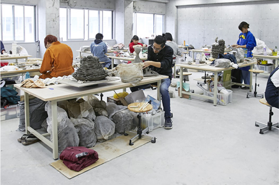 国内大学で最大級の規模を誇る工房には専用の設備や道具が揃い、専門性の高い造形経験を積むことができます。一人ひとりに制作スペースが与えられ、原則的に課外時間でも利用可能なため十分に制作活動に専念できます。