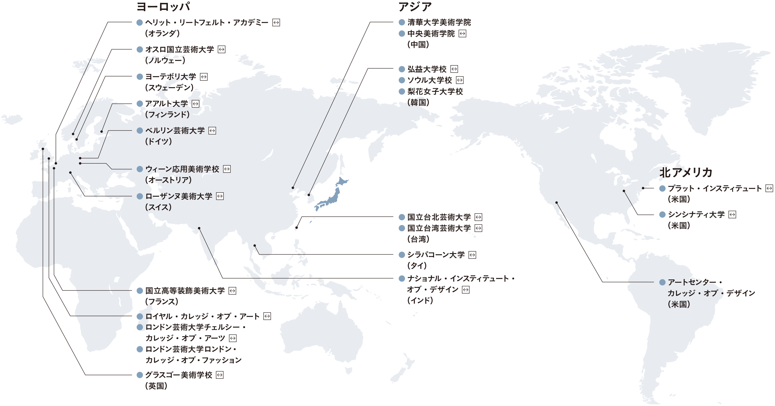 世界トップクラスの美術大学との交換留学を実施。各エリア精の名門美術大学と海外協定を結び、質の高い教育を推し進めています。