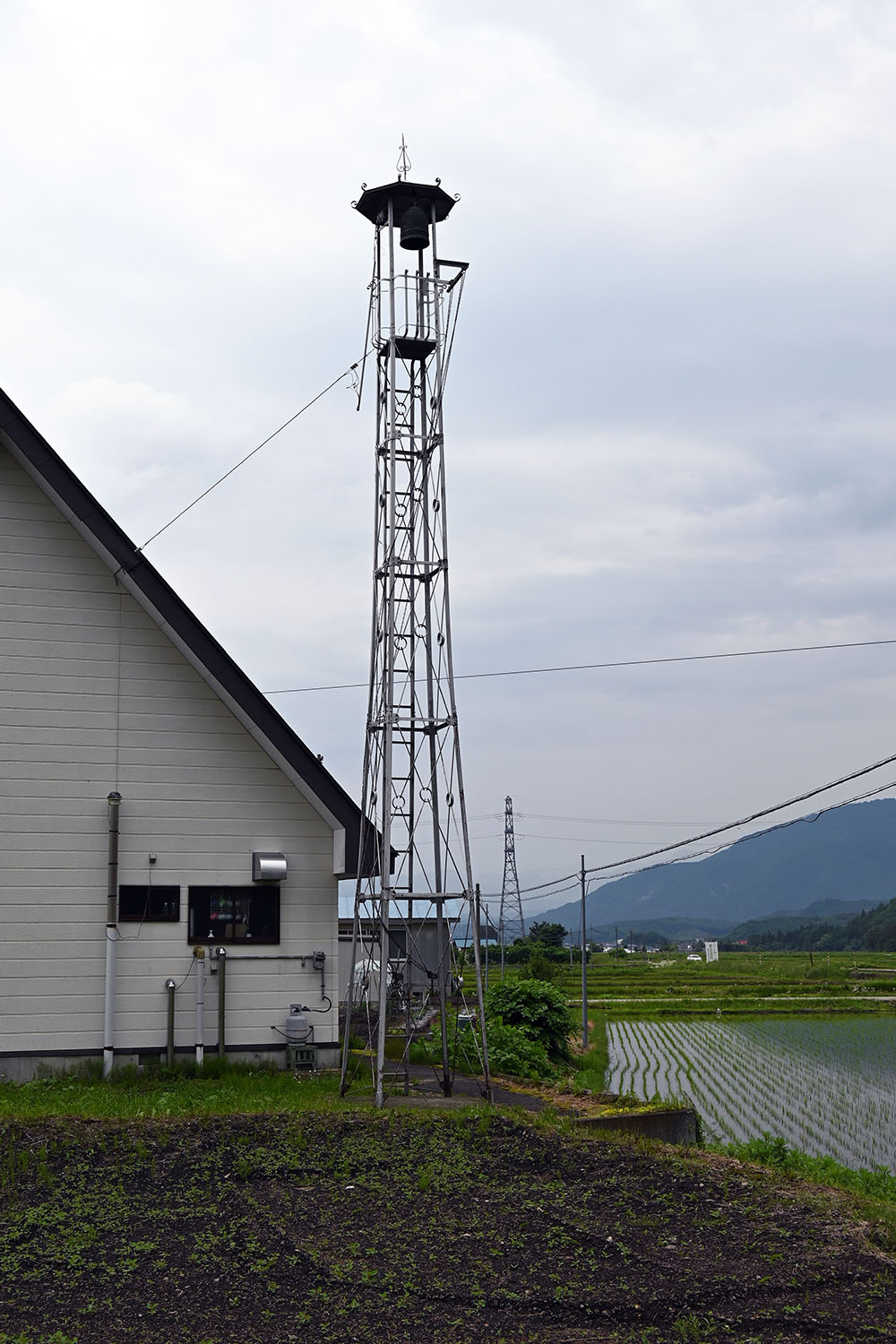 細身の4本脚に八角形の屋根。左の大屋根がポンプ小屋。柱は50×50と細め。