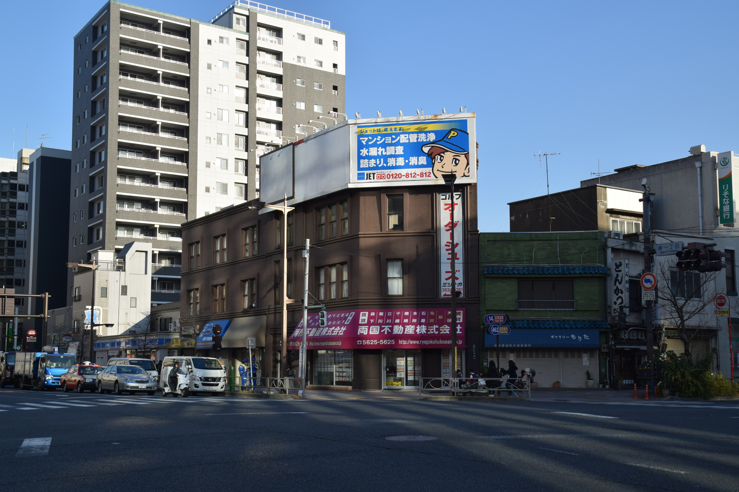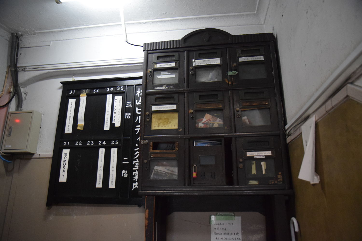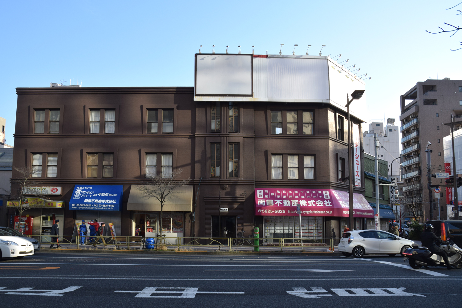 交差点の角地に建つ奥行きが浅いビル。道路拡幅による解体。階段やポストなど共用部分は当初のインテリアが残っていた。末期にはコスプレのスタジオなどが入っていたようだ。関東大震災で大きな火災被害があった地域で、RCの3階建てには復興の願い が込められていたことだろう。