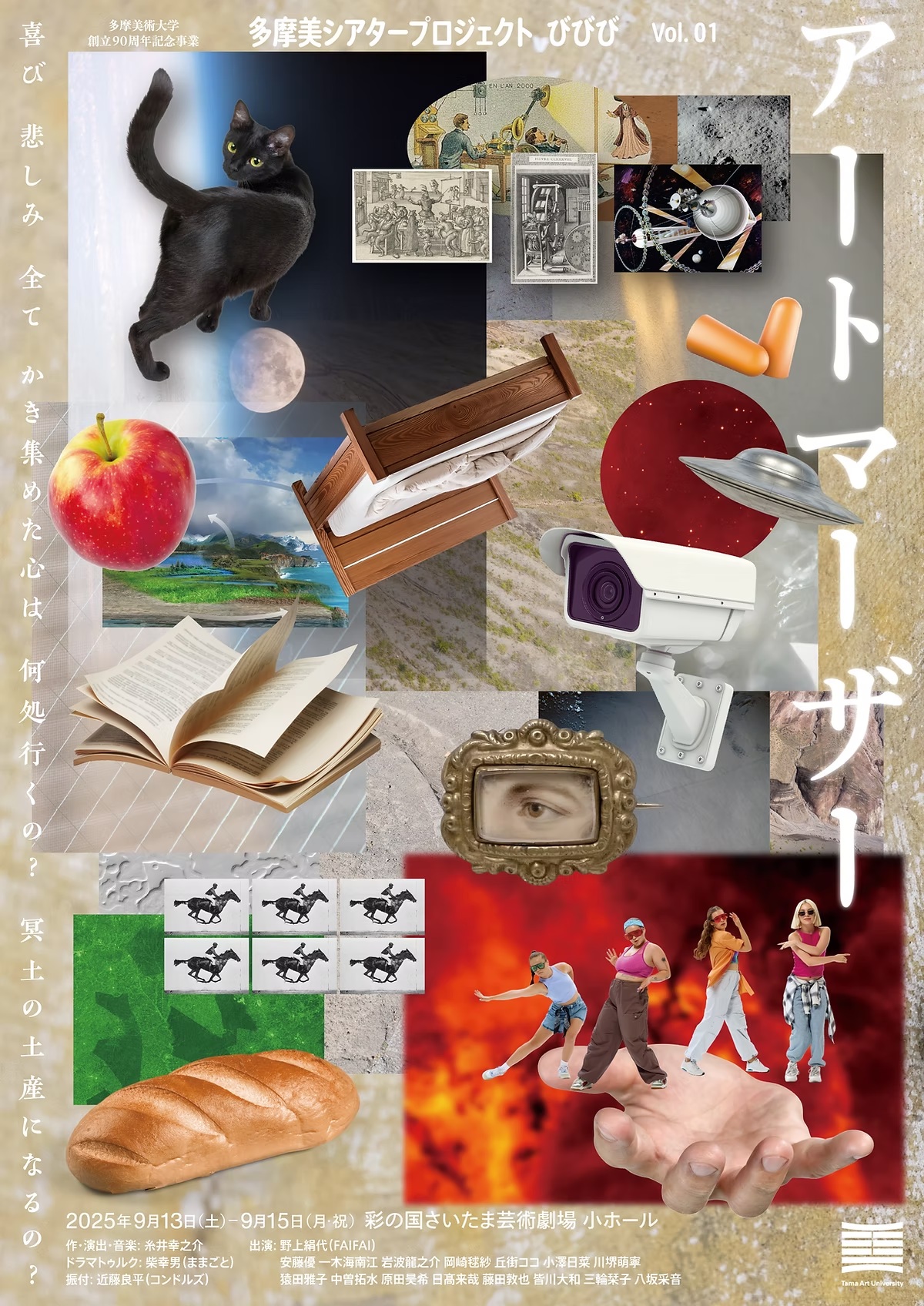 多摩美術大学 演劇舞踊デザイン学科は、創立90周年記念事業の一環として「多摩美シアタープロジェクト びびび」を始動、9月に彩の国さいたま芸術劇場にて第一弾『アートマーザー』を上演します。本プロジェクトは、演劇舞踊デザイン学科が中心となり、本学の学生と、第一線で活躍する表現者が協働して作品を創作・上演するものです。