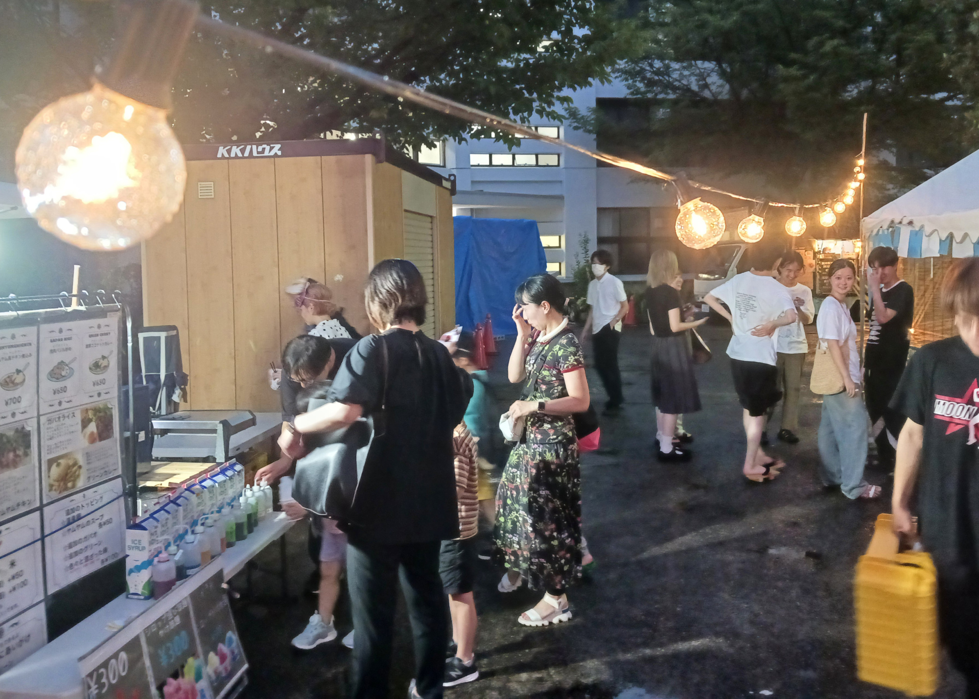 冷たい飲み物や軽食を提供する屋台が並び、夕暮れから夜にかけてキャンパスを賑やかに彩りました。 -