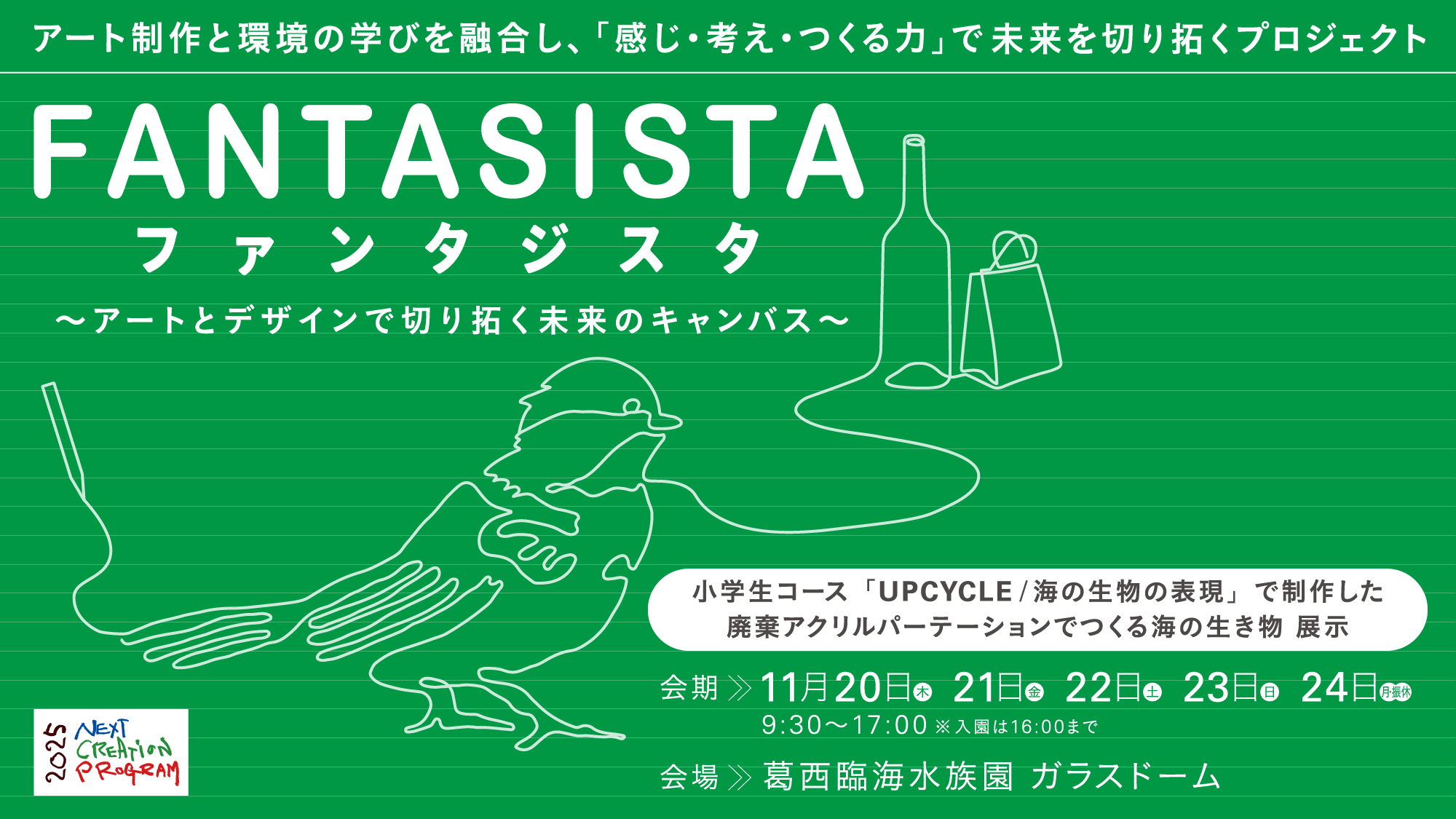 東京都、アーツカウンシル東京、多摩美術大学が主催するネクスト・クリエイション・プログラム「ファンタジスタ~アートとデザインで切り拓く未来のキャンバス~」。このプログラムでは、小学3年生から高校3年生(18歳以下相当)を対象に、アート教育と環境教育を一緒に学び、これからの未来を生きる子供たちに必要な「創造する力」を育む芸術文化体験プログラムを展開してきました。アート教育では、正解のない課題に臆せず、創造的に挑む姿勢を。環境教育では、大きく複雑な課題を自分ごととして捉え、粘り強く向き合う姿勢を。この二つを結び合わせることで、柔軟な発想力を持ち、前向きに未来へと進む力を備えた人を育てたいと考えました。11月7日~9日の3日間、その成果を集約した作品展を開催いたします。