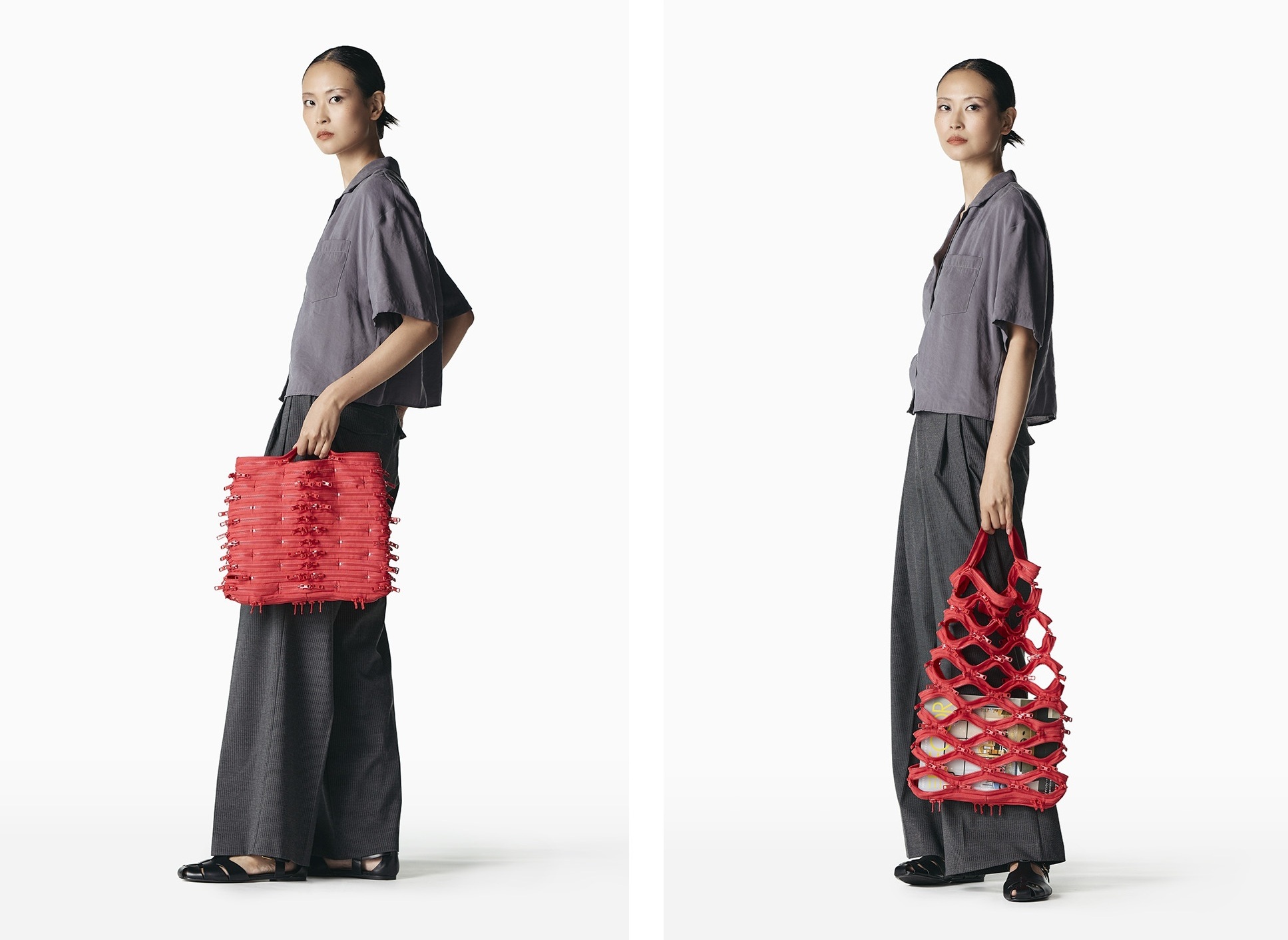 『FASKET』は、ファスナーの開閉によって形が変化し、伸縮するバッグです。制作のきっかけは、ファスナーを開閉した際に「意図せず開かないままくっついてしまう部分があった」という小さなエラーに面白さを感じたことでした。その偶然性をヒントに、ファスナーの新しい可能性を追求し、形が変化するユニークなバッグへと発展させました。