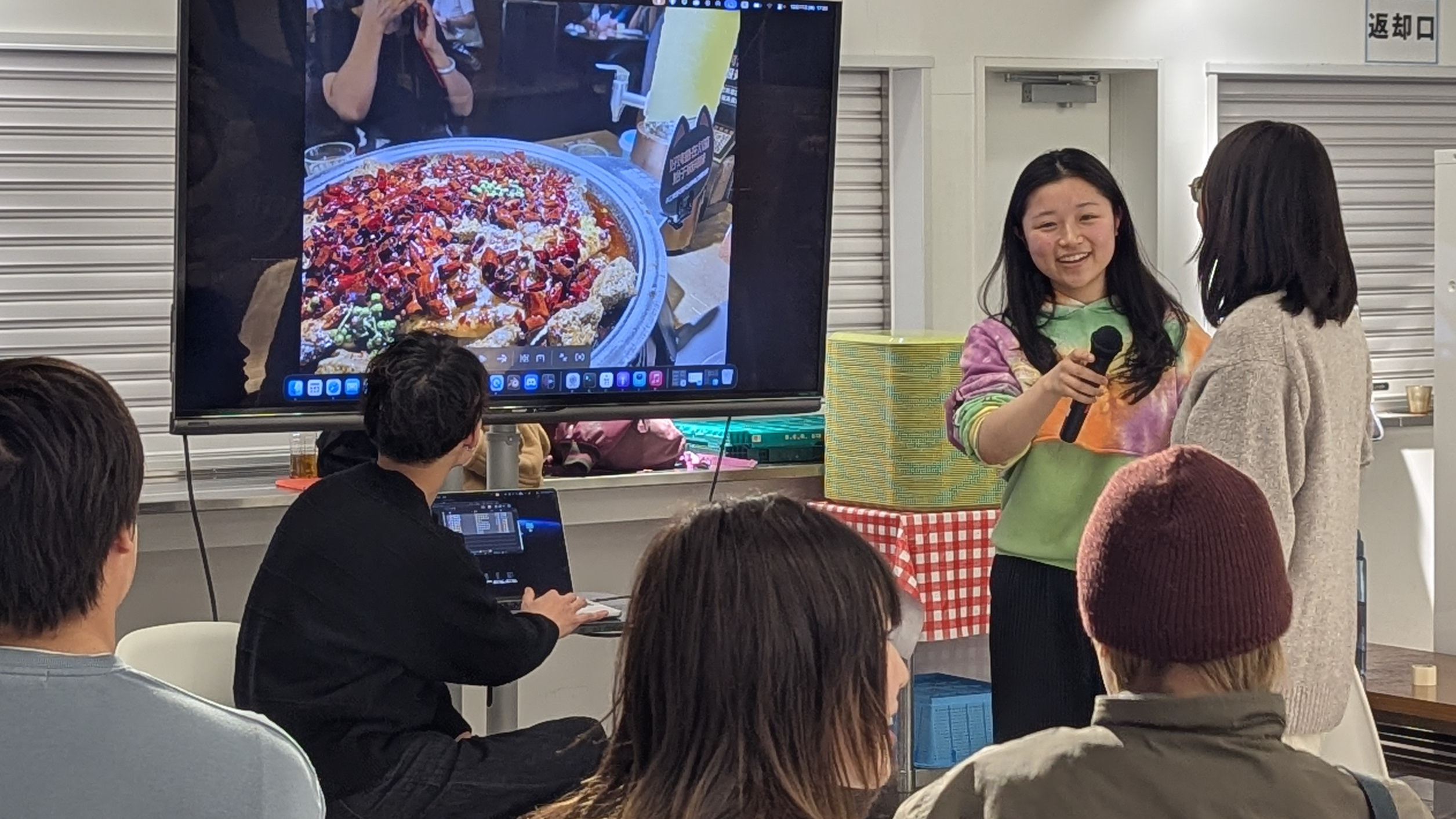 上野毛キャンパスで開催された国際交流パーティーでは、お菓子や飲み物を楽しみながら、チームに分かれてジェスチャーゲームが行われました。ユニークなお題に会場は笑顔と歓声に包まれ、英語や日本語といった言語の枠を超えたコミュニケーションの場が生まれていました。また、留学生による写真紹介のコーナーでは、それぞれの国の食べ物や文化が紹介され、参加者が異文化への理解を深める機会となりました。