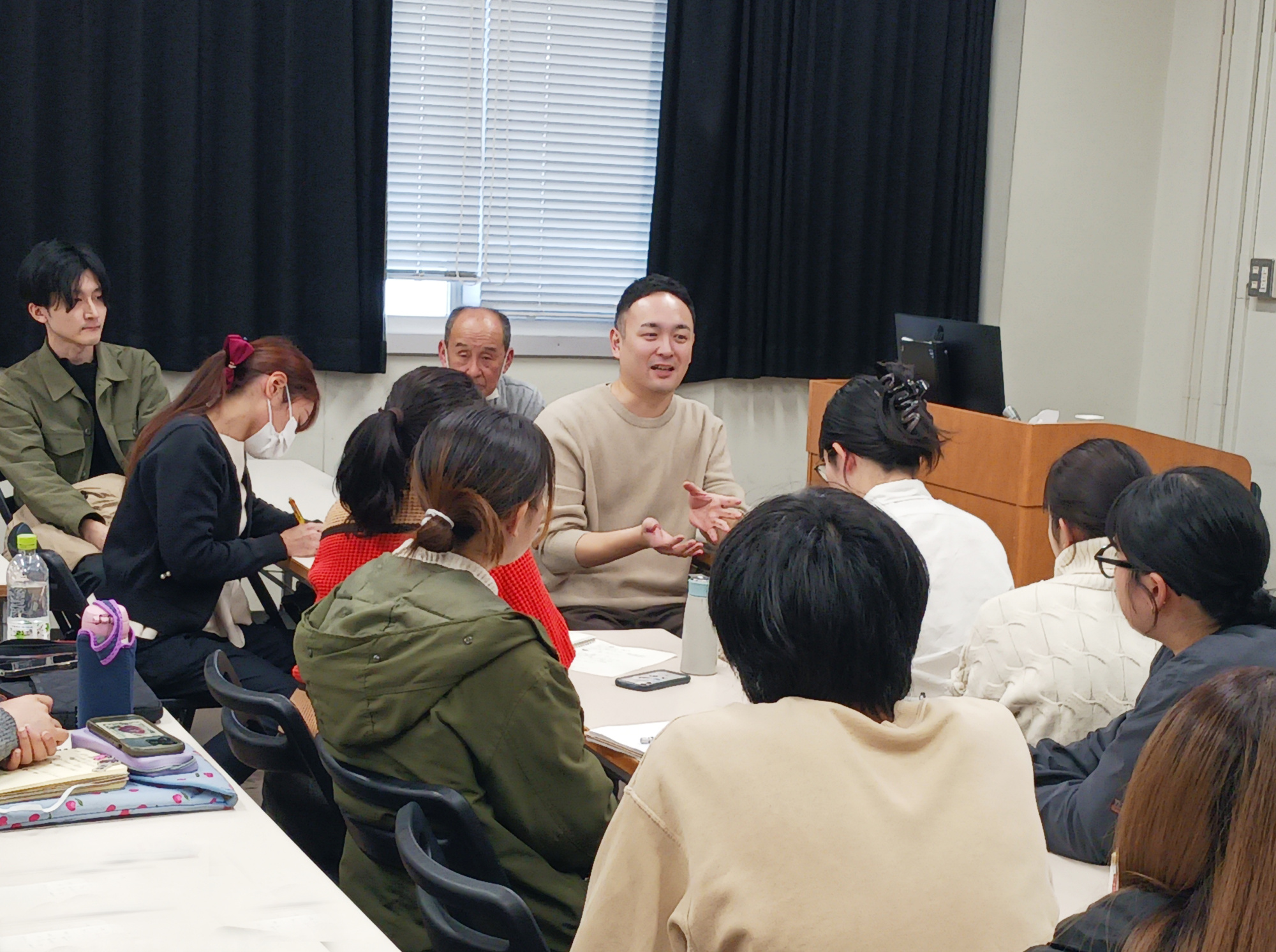 学生のプレゼンテーションの後には、来学した職人の方々と学生が2つのグループに分かれて対話の時間が設けられました。学生からの質問に職人の方々が丁寧に答えたり、制作工程の裏側や日々の仕事の実際についてより詳しく語っていただいたりと、活発なやり取りが続きました。また、「どのようにしたら学生世代や生活者に輪島塗をより身近に感じてもらえるか」といった職人側からの問いかけもあり、伝統工芸とデザインを学ぶ学生との間で多角的な視点が交わされる貴重な対話の場となりました。
