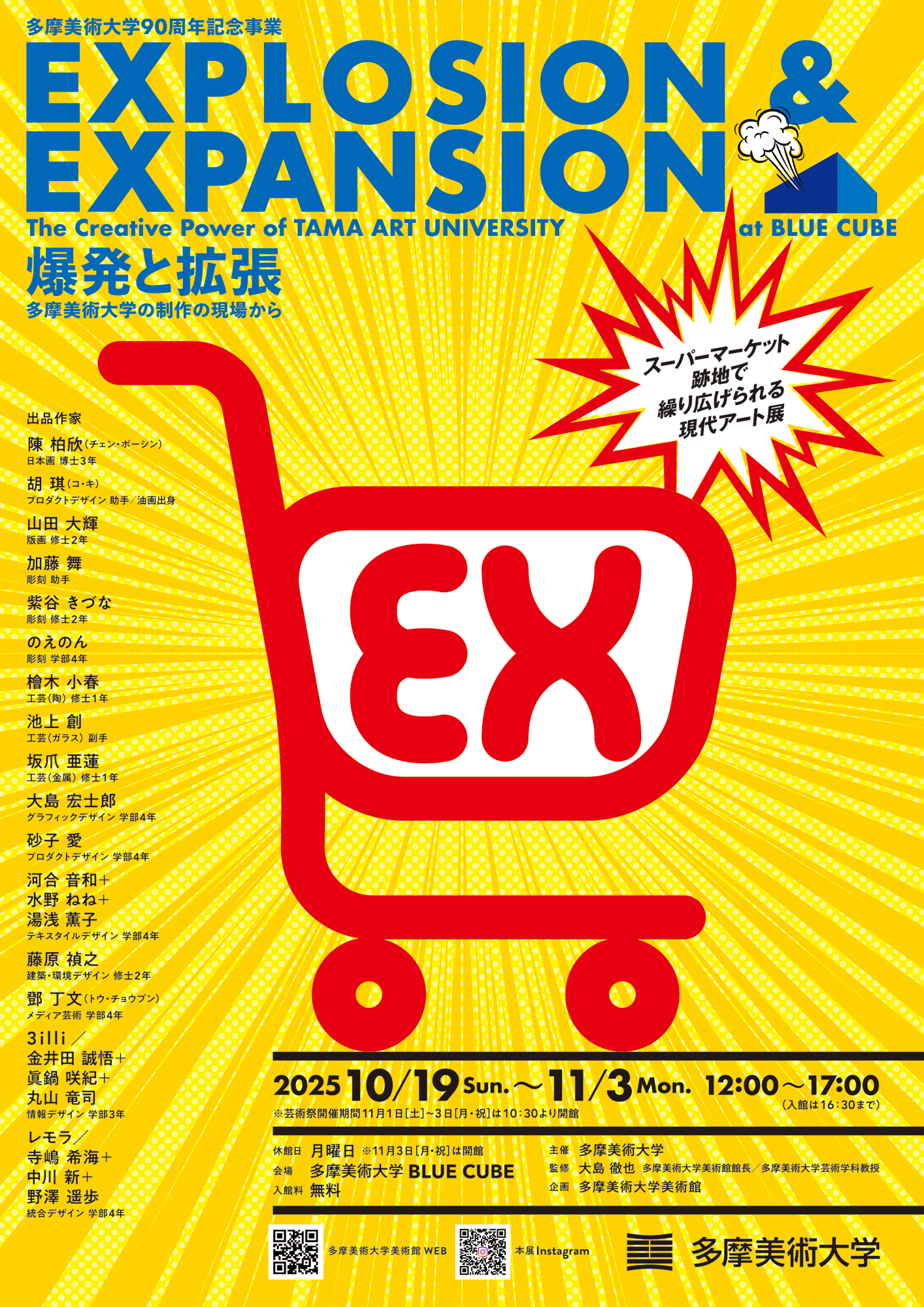 会場は旧METRO多摩境店のBLUE CUBE。かつてスーパーマーケットだった場の構造や雰囲気、歴史の重層性の中で、独自のエネルギーを発するさまざまな作品がぶつかり合い、多摩美らしいエキサイティングなアート空間が現出します。