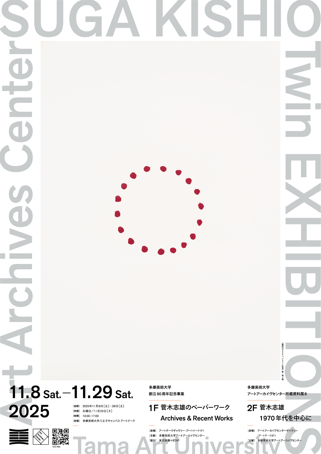 多摩美術大学絵画学科の卒業生である菅木志雄は半世紀以上にわたり精力的に制作、発表を続け、執筆活動とともに独自の美術思想を明らかにしてきた。菅は「もの派」を代表する作家として近年国際的な活躍が著しい。東京画廊+BTAPで保管されていた菅関連資料をアートアーカイヴセンターでデジタルアーカイヴ化、2023年度に公開した。これを記念し、2000年代の未発表ペーパーワーク作品を中心にAAC所蔵資料をまじえて展覧会を開催する。菅の作品世界に触れ、学ぶ機会とする。