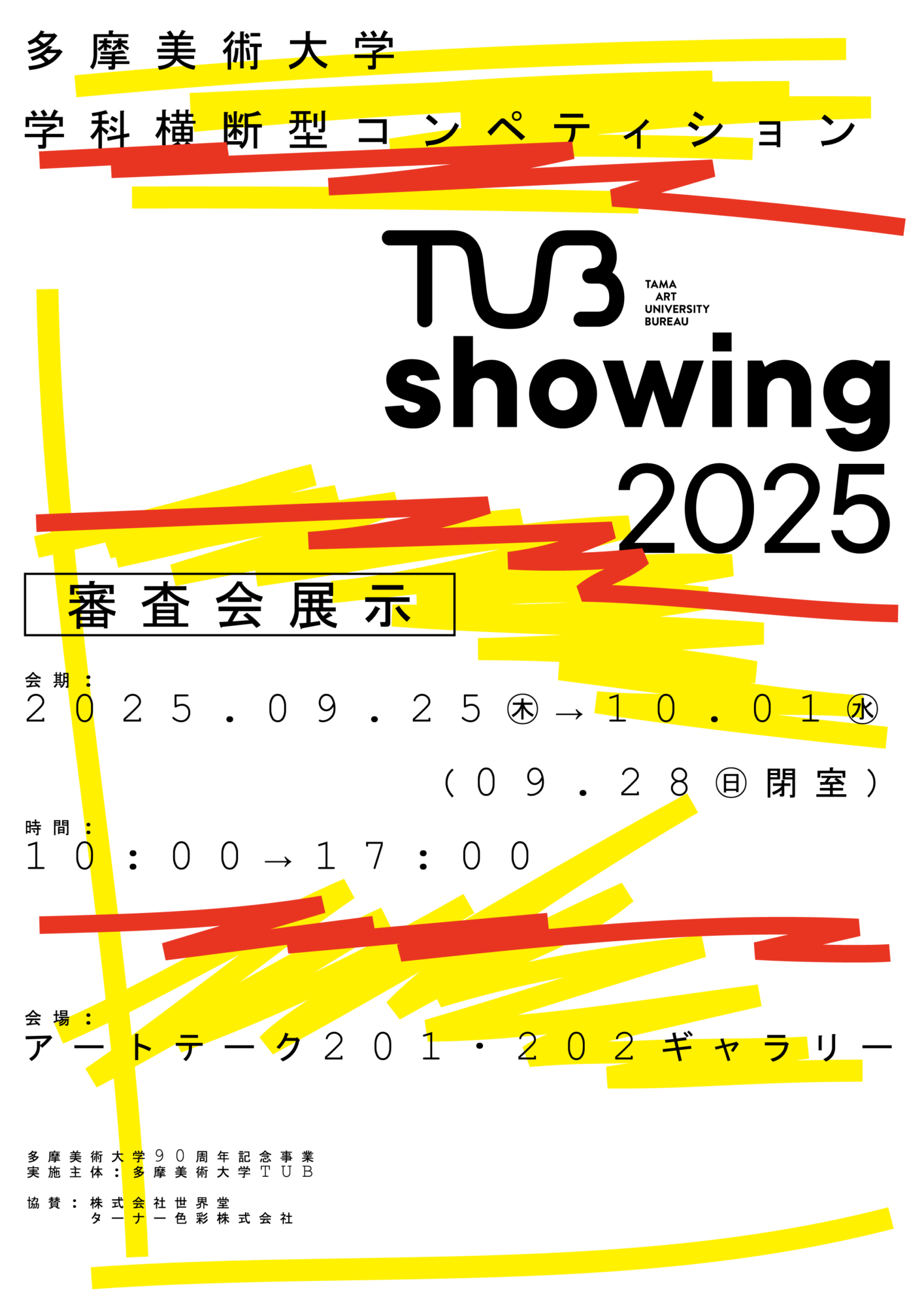 TUB showingは多摩美在学生を対象とした学科横断型のコンペティション企画です。学科を超えた交流の場の創出、学生の創作活動の社会への発信を目的とし、2023年から開催しています。3回目となる今回は、八王子キャンパスにて審査会と授賞式及び交流会を実施し、後日、審査で選ばれた受賞者による展覧会をTUBで行います。